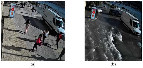 Site V1. Inundation starts at 12:22:46, people run to evacuate (a). At ~12:26, general flooding is noticed, cars float (b) (video time is corrected, see details in text; photo credit, Hertz office).