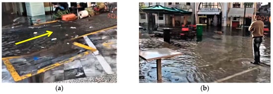 Site V5. Water flow upstream (arrow) during the second inundation (a). At the upper square side (d = 98 m), the water depth reached only a few cm (b). Run-up h~2 m asl has been estimated. Most people evacuated but a few look like enjoying the inundation (photos credit, Samos.24).