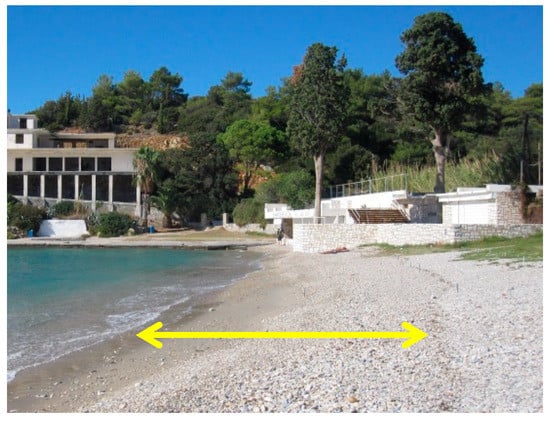 V7. Gagou beach, northeast Vathy bay (37.765419, 26.964838). In this beach (Figure 3 and Figure 14), a local resident was sunbathing when the ground shook. According to the eyewitness, the leading tsunami wave phase arrived ~10 min after the earthquake and inundated up to d~4–5 m. The second tsunami wave was noted about 15 min after the first and penetrated inland up to d~6–7 m. The eyewitness reported that the maximum inundation line was determined by the seaweed line left behind in the beach (Figure 14). The estimated maximum run-up did not exceed h~0.4 m. The eyewitness said that after the second inundation the sea oscillated another 2–3 times with periods of about 10–15 min.