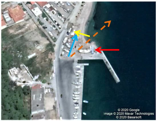 Site V8. Tsunami run-up of h~1.25 m was measured at d = 20 m (yellow arrow). A boat was drifted away by ~20 m (blue arrow, see also Figure 16). Another boat was lost in the sea (orange arrow). An iron container (red arrow, pre-seismic position) was moved away by ~8–9 m and rotated ~35° counterclockwise (see also Figure 16a and Figure 17).