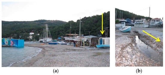 S1. Psili Ammos bay (37.7072114, 27.0166114). In the sandy beach of the bay, we observed a wet zone of ~5–6 m in width as well as a line of seaweed situated at the same distance from the shoreline (Figure 27a). A local resident, an owner of sun beds and an eyewitness of the event, verified that the wet zone and the water mark were due to the tsunami inundation. He said also that the first wave arrived ~25–30 min after the earthquake. Possibly, this was the second wave observed in Vathy. After water retreat for ~20–25 m, the sea was slightly inundated again and oscillated 3–4 times with periods of ~10–15 min. We roughly estimated h < 0.5 m.
