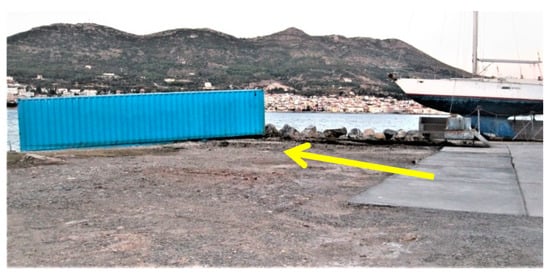 V8. Malagari beach, southwest Vathy bay (D = 17 m, 37.754984, 26.957526). The owner of a local cantina (Figure 15 and Figure 16a), who experienced the tsunami himself, reported material damage due to run-up of h~1.1 m. In a fence wall at ~3 m further inland, we measured h = 1.25 m asl. The eyewitness said that from the three small fishing boats he had onshore nearby the cantina, only one remained standing. One boat was lost in the sea, while another one was dragged by the wave and left in a new position ~20 m away (Figure 15 and Figure 16a). Ground erosion was locally caused during the wave withdrawal process (Figure 16b). The beach and the nearby pier were found covered by sea sand and salt. In the same area, an iron container of 13 m × 2 m × 2 m in dimension was drifted away for about 8–9 m and rotated ~35° counterclockwise (Figure 15, Figure 16a and Figure 17). According to Port Authority officers, the container was full of marine anti-pollution equipment. We roughly estimated the container weight at ~10 t.