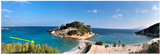 Site N2. According to a local resident, the tsunami moved as shown by the arrow, i.e., from NW to SE; the sea level rise completely covered the short “neck” connecting the land with the islet (photo credit, Ioanna Georgoudi).
