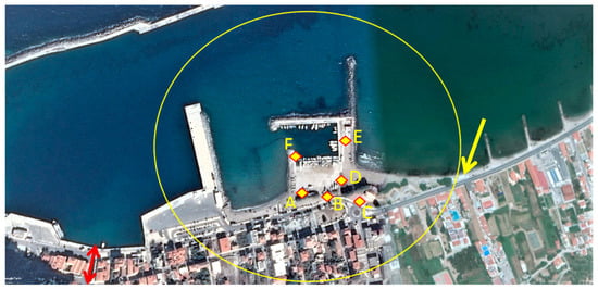 Sites of field observations in the Karlovasi vessels shelter (marina, circle) situated to the east of the port. Yellow arrow shows site K1. A–F are observation points in site K2. Double red arrow shows an inundation transect adjacent to the port authority building, K3.