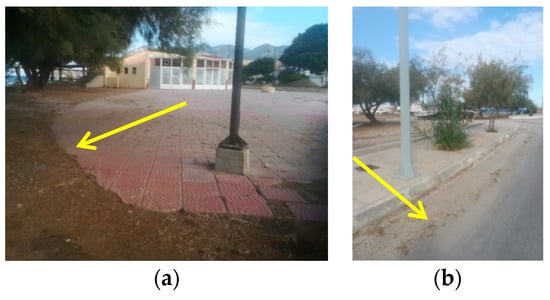 Site V3. In Xrisostomou Smirnis street, close to the “Garden Restaurant”, we measured h = 0.3 m (a) and h = 0.24 m (b) above ground level at d = 85 m and 87 m, respectively. The value of h minimized at d~102 m, where we estimated maximum h = 2.0 m asl (photos credit, I. Triantafyllou).
