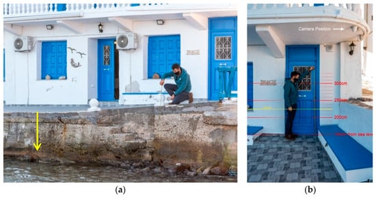 Site K4. Team member performed measurements and found the house entrance level at a height of ~1.50 m asl, including the co-seismic uplift of ~20 cm (yellow arrow) (a). Heights asl in the door below the security camera (white arrow) are marked (b) (photos credit, M. Thravalos).