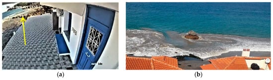 K4. Ayios Nikolaos beach (D~5.8 km east of Karlovasi Port, 37.8127922, 26.7414823). Τhis is a key site for two reasons: (1) it is the closest to the earthquake epicenter (Δ~12 km), (2) a video record, which comes from a security camera installed in a house situated in a settlement on steep slope very close to the shore (Figure 23a,b), provides a unique opportunity to accurately reproduce the timeline of the sea level changes. Field inspection and collection of eyewitness accounts completed our observation set. The house owner, an eyewitness of the event, reported that the camera is satellite synchronized and, therefore, the time is absolutely accurate. Before the earthquake occurrence, the level of the house entrance was situated at h~1.30 m asl. However, the house owner reported that with the earthquake the sea level in the area dropped by ~20 cm, which is consistent with our field survey indicating co-seismic coastal uplift in this site (Figure 23a), as well as in other coastal spots of the island [,]. The house entrance level beneath the camera was measured at 1.50 m asl (Figure 23b).