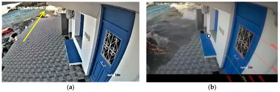 Site K4. The wave propagated obliquely to the coast from east to west (arrow) (a) and inundated the entrance of the house (b) (photos credit, Cornilia Papakonstantinou from security camera).