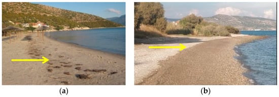Tsunami water marks in Psili Ammos beach, site S1 (a) and in Heraion beach, site S3 (b) (photos credit: G.A. Papadopoulos (a) and anonymous (b)).