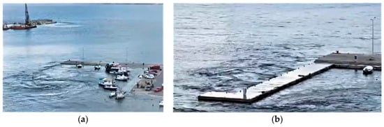 In position F (site K2, Figure 19), the wave overtopped the pier (h~0.7 m) and moved a small boat ashore (a) (photo credit, M. Gogou). The Karlovasi pedestrian zone in front of the Port Authority building (K3, Figure 19) inundated ~8 min after the earthquake (b) (photo credit, video by Port Authority).