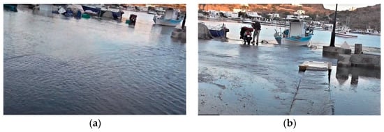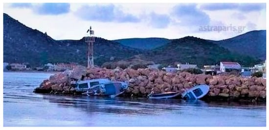 In north Samos, the main damage was caused in both sides of the Vathy bay, in the port and marina area of the Karlovasi town and in the Ayios Nikolaos settlement. In the east Vathy bay and in Karlovasi, damage was mainly noted in cars and small boats as well as in houses, offices, hotel lobbies, shops, restaurants, cafes and other stores, all situated at the ground level up to ~100 m maximum run-in distance. Similar types of damage were observed in the localities of Zeytineli, Sigacik, Akarca and Tepecik of western Turkey []. In the west Vathy bay (Malagari settlement, V8), limited indoor damage was reported while a small boat was lost in the sea. A big iron container with an estimated weight of ~10 t was moved from its initial position. In the Ayios Nikolaos settlement (K4), minor indoor damage was caused in a couple of households, while a few small boats were either damaged or lost in the sea. In south Chios Island, a few small boats were damaged too.