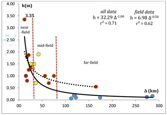 The study of the 2020 Samos tsunami provides, for the first time in the eastern Mediterranean, data accurate enough to reliably approach the tsunami attenuation in terms of height (h) decay as a function of epicentral distance (Figure 31). The decay of h is faster according to Formula (1) as compared to the decay predicted from Formula (2). This is due to the field data having been available only in the near-field and mid-field domains, i.e., at Δ < 80 km, with the exception of only one value taken at Δ = 165 km. On the contrary, Formula (2) was found using not only field data but also far-field data from tide-gauge records. On the other hand, the Formula (3), which is based on old data of low accuracy, overestimates the wave height in relation to (1) for Δ > 40 km and in relation to (2) for all Δ values. The reason is that the Formula (3) has been produced assuming that no height decay occurs in the near-field domain (Δο = 30 km). This assumption was adopted very likely due to the low accuracy of the near-field data used by the authors [] proposing the Formula (3). However, the present study as well as the studies of other recent tsunamis [,] showed that the tsunami height decays even in the very near-field domain.