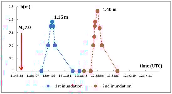 The residents in site K4 reported that a second but smaller inundation arrived around 12:15. Unfortunately, it has not been recorded since the camera was out of order due to power outage. However, the second inundation did not move in parallel to the coast, as the first did, but it happened as a more or less uniform sea level rise along the shore. The water depth at the house entrance level due to the second inundation was estimated by the residents at ~10 cm, i.e., ~1.60 asl. The video recording came back soon showing a completely calm sea at ~12:31. Last, the residents recalled their parent’s account that the area was also hit by the 9 July 1956 large tsunami (Figure 1).