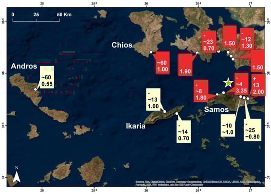 Main tsunami features in the Greek islands of Samos, Ikaria, Chios and Andros (present study) and in western Turkey localities (after []); data in Table 2 and Table 3. Star illustrates the 30 October 2020 earthquake epicenter. The three rows in each panel show polarity (top), arrival time of leading wave (in minutes after earthquake, mid) and maximum run-up, h (in m, bottom). A locality is represented in the map only if h > 0.5 m. Signs + and - stand for leading sea rise and recession, respectively. Lack of a row reflects lack of data. Panel in red or beige shows locality damaged or not damaged by the tsunami, respectively. Tsunami damage was extended in an area of ~4000 km2.