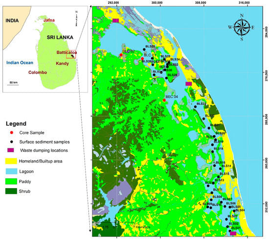 - Adikaram, M.; Pitawala, A.; Ishiga, H.; Jayawardana, D. Spatial distribution, enrichment, and source of environmentally important elements in Batticaloa lagoon, Sri Lanka. Environ. Sci. Pollut. Res. 2017, 24, 2089–2099. [Google Scholar] [CrossRef] [PubMed]