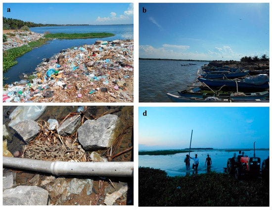 During the past few decades, large-scale human activities, such as poor agricultural practices and fish and prawn farming, have degraded the quality of the natural environment of the lagoon [22,23]. Presently, most of the marshes and channels have been converted to paddy lands, which are cultivated in two seasons of the year. Except for the few main city areas, surrounding areas of the Batticaloa lagoon are covered by extensive paddy lands (Figure 1). In addition, municipal waste disposals and domestic effluents are common in the places where the population is high. Field surveys on the peripheral regions of the Batticaloa lagoon noted the direct anthropogenic influences on the natural lagoon environment. Domestic effluents and municipal wastes are directly dumped in to the lagoon without any pretreatments (Figure 2). In addition, the effluents of the toilet drain pipes as well as car wash stations are directly released to the lagoon water.
