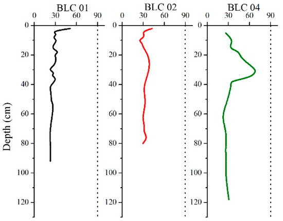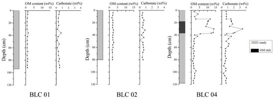 Core samples BLC 01and BLC 02 show unique distribution throughout the length of the core, while BLC 04 indicates different sedimentation processes between 18–36 cm depth. A dark brown to black color organic matter-rich layer is observed in BLC 04 from 18 to 36 cm depth. The OM content of BLC 01 and BLC 02 varies between 0.8–1.5 wt. % and 1.6–2.6 wt. % respectively showing a minimal to unvarying distribution (Figure 3). The dark color organic matter rich layer of BLC 04 shows higher OM contents (ranging from 9.1–15.0 wt. %) than the other sediment units of the same core (0.8–4.9 wt. %). Carbonate contents for both BLC 01 and 02 cores are less than 1%. The organic matter rich unit of the BLC 04 indicates comparatively high carbonate content following the similar trend of OM in distribution indicating its sudden deposition nature with a different force.
