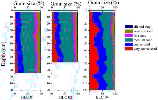 Significantly, all sediment cores of Batticaloa Lagoon indicate very low clay fraction indicating 7% as the maximum for all cores (Figure 4). BLC 01 and BLC 02 cores show similar grain size distribution with high medium to coarse sand contents. The very coarse sand fraction of those cores decreases upward. In average, the grain size of BLC 04 indicates more than 50% of coarser fractions. The organic matter rich layer displays highest very coarse sand fraction and very fine sand fractions indicating a sudden sediment deposition for the unit. Recent studies found that the sedimentation rate of Sri Lankan lagoons is varying between 0.1–0.2 mm/yr considering both eastern and western parts of the island [31,32]. Hence it can be suggested that the above sudden event of the organic matter rich layer would have been deposited before about 900–1800 years. Probably a cyclonic event of the Bay of Bengal region would have been deposited this interesting organic matter rich layer.