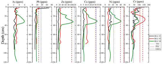 The overall concentrations of As, Zn, Cu and Ni of sediment cores of Batticaloa lagoon are below the TEC and IAEA values except the organic matter rich layer of BLC 04 (Figure 5). Including the organic matter rich layer of BLC 04, concentration of Pb indicates lower values than TEC and IAEA, whereas, the higher values are observed in the surface layer of BLC 01 and BLC 02. In contrast, surface sediments show lower values for both As and Pb than TEC [23]. The concentration values of Cr in all Batticaloa lagoon cores are fluctuating around TEC value. The 20–40 cm depth of BLC 02 and surface layer of BLC 01 have exceeded the PEC values for Cr. The concentration of Cr in all surface sediment samples are above the TEC values and some of them exceeded the PEC values [23].