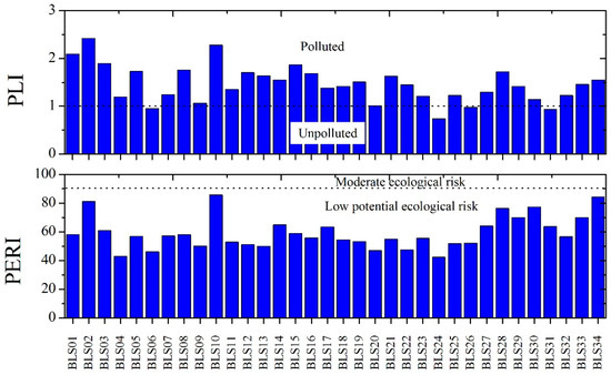 The calculated PLI values and PERI values of surface sediments of Batticaloa lagoon are graphically presented in Figure 6 with reference to the data published in Adikaram et al. [23]. The PLI values ranging from 0.74–2.42 for surface sediment samples indicating that the surface sediments are polluted except 3 locations at BLS 06, BLS 24 and BLS 31. These three locations are in the general central flow paths of the lagoon and away from the direct channel discharging zones.