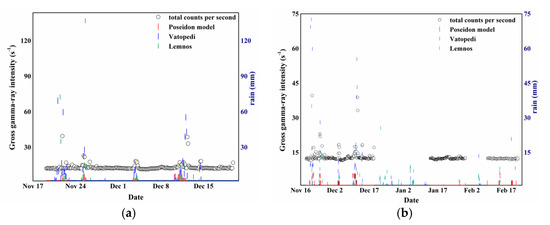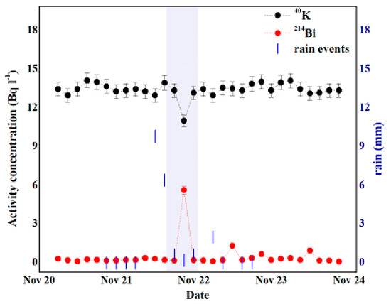 - Bottardi, C.; Albéri, M.; Baldoncini, M.; Chiarelli, E.; Montuschi, M.; Giulia, K.; Raptis, C.; Serafini, A.; Strati, V.; Mantovani, F. Rain rate and radon daughters’ activity. Atmos. Environ. 2020, 238, 117728. [Google Scholar] [CrossRef]
