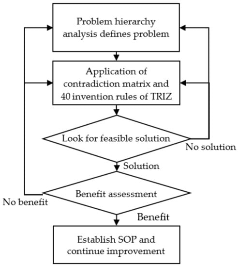 This study improved the new ship manufacturing process, with a goal to increase production efficiency. The research method uses TRIZ as the main axis, as shown in Figure 1. First, the problem hierarchy analysis was used to define the problem, the physical contradiction pattern in the problem was analyzed, and the problem hierarchy analysis rules were used to seek a solution. Afterwards, the 39 engineering parameters and 40 invention rules of TRIZ were used to seek a feasible solution in the contradiction matrix, and the feasible solution was embodied into the actual solution []. Finally, the benefit assessment was implemented. If the anticipated benefit is reached, the SOP (standard operation procedure) is established and the improvement continues. If the anticipated benefit is not reached, the TRIZ is used circularly to seek an innovative improvement method []. Related research methods and tools are described below.