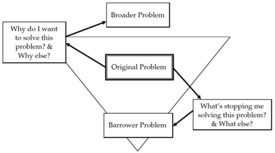 In the TRIZ method, the major function of problem hierarchy analysis [] is to redefine and assist in clarifying the potential by-problems of a target problem, laying emphasis on seeking the incentivizing solutions to and factors underlying the problem. Hence, the target problem is expanded (enlarged) and focused (diminished) simultaneously based on two questions, which are: “Why do I want to solve this problem? and Why else?” and “What’s stopping me solving this problem? and What else?”. Hence, there is the probability of solving the original problem on other expanded or focused hierarchies, as shown in Figure 2. In terms of expansion of hierarchy, the incentive to solve this problem is continuously inquired upwards with the original problem grid (at the middle) as the starting point, and, then, the original problem is expanded gradually. Hence, the cause of the problem and more specific problems that may arise by solving the problem are repeatedly analyzed downward, the original problem becomes gradually focused on.
