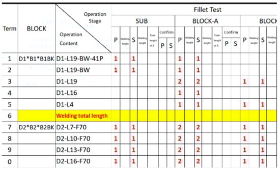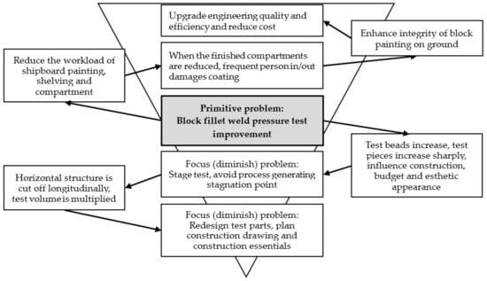 In the problem analysis, the BLOCK pressure test selected in this study is shown in Figure 4. The traditional operating mode performed bead pressure test operation while refitting the compartment fillet weld pressure test operation in the BLOCK stage. The correlation between each assembly and resources in this original operation flow was made into a model view by the “substance-field analysis” of TRIZ, and the potential solution of the problem was explored from the model point of view. Finally, problem-solving was deduced using TRIZ, so as to obtain the overall architecture of problem improvement.