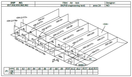The new ship pressure test operation was performed by quoting the deduced #1: Segmentation, #2: Taking out, and #24: Intermediary. The engineer establishes the LIST fitting the working drawing, as shown in Figure 8. The pressure test information of each block is built in the production system by LIST, so that the production line managers can know the positions and workload from the stereogram, as shown in Figure 9, contributing to work preparation and implementation.