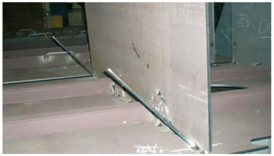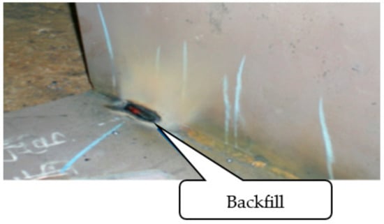 The pressure test steel tube was fixed by ironwork spot welding, in order to guarantee the consistency of electric welding workmanship. As shown in Figure 15, the pressure test steel tube was welded to the fillet weld in the electric welding operation.