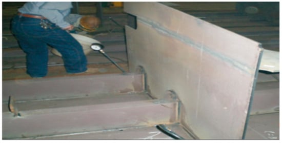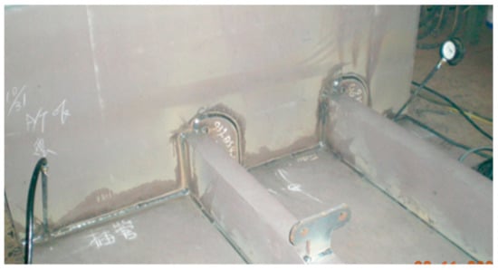 The compartment watertight wall pressure test method and air pressure test specification for new ships are fundamental shipbuilding regulations. Therefore, the special primer is the practice before improvement. When the block is sandblasted, the compartment bead before the pressure test is coated with the classification society-approved precoating prime to prevent corrosion. When the pressure test is finished, the bead is derusted and painted again []. The hydrostatic test operation for the newly built ships is usually difficult to be replaced. Thus, in the shipbuilding circles, when the compartment is finished, the whole compartment is filled up with water for the test for air pressure test; this replaces the vacuum test and fillet weld pressure test.