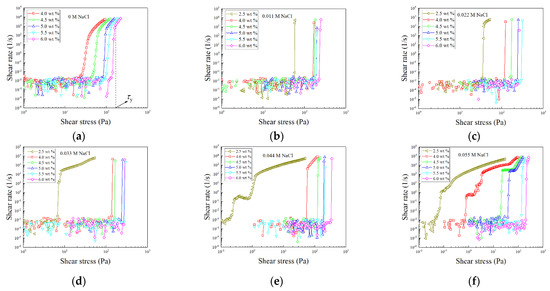 Shear rate versus shear stress curves at different clay concentrations at the ionic strength of (a) 0 M, (b) 0.011 M, (c) 0.022M, (d) 0.033M, (e) 0.044M and (f) 0.055M, respectively, for laponite suspensions.