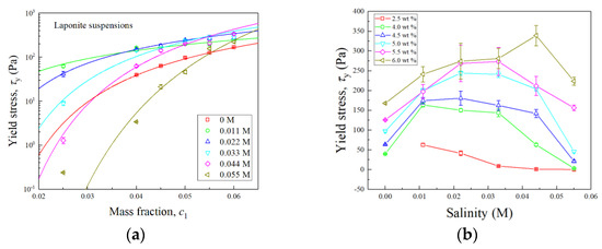 (a) Change of the yield stress as a function of clay concentration at different ionic strength for laponite suspensions, with solid curves representing the fitting of the data using Equation (4); (b) change of the yield stress as a function of ionic strength at different clay concentrations.