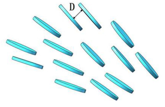 It is assumed that the face-to-face repulsive inter-particle interaction dominates, which results in a face-to-face structure, as shown in Figure 5. Therefore, the volume fraction can be related to the distance between clay platelets, , where δ is the thickness of clay platelets, and α is a correction factor. The term from van de Waals interaction can be neglected [2]. Moreover, . Therefore, Equation (3) can be rewritten as