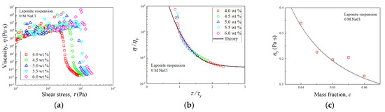 where η0, K and m are constants determined experimentally, as listed in Table 6. It should be noted in Figure 6b that at , the system is at the yielding point, and shear inhomogeneity, as well as slippage at the boundary, are likely to occur [7,17,18]. Therefore, theoretical curves diverge from the experimental data. The master curve of viscosity allowed us to capture the non-Newtonian behavior of laponite suspensions at different concentrations, once the yield stress and characteristic viscosity was known. As mentioned previously, τy can be estimated by Equation (4). And as shown in Figure 6c, the evolution of ηy with the clay concentration for laponite clay studied here may be approached by .