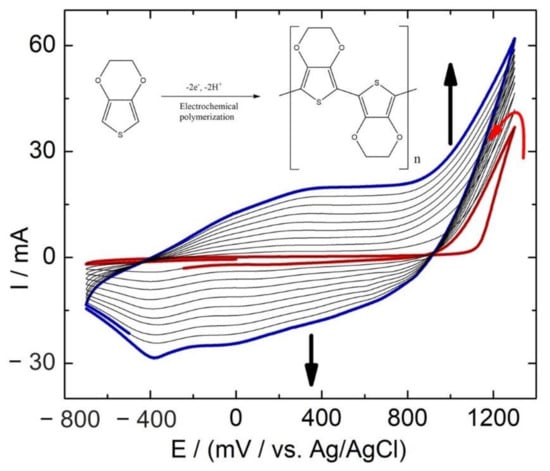 - Del Valle, M.A.; Ramírez, A.M.; Hernández, L.A.; Armijo, F.; Díaz, F.R.; Arteaga, G.C. Influence of the supporting electrolyte on the electrochemical polymerization of 3,4-ethylenedioxythiophene. Effect on p- and n-doping/undoping, conductivity and morphology. Int. J. Electrochem. Sci. 2016, 11, 7048–7065. [Google Scholar] [CrossRef]