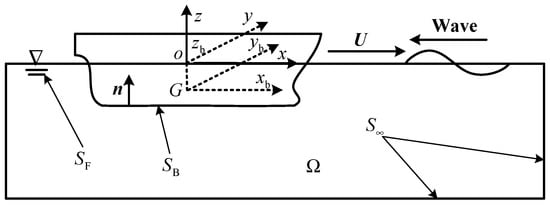 Based on the linear potential flow theory, the fluid is assumed to be irrotational, inviscid, and incompressible, and there is no fluid separation or lifting effect []. In the reference coordinate system , the total velocity potential in the infinite water can be written as