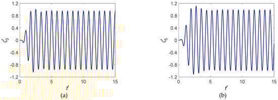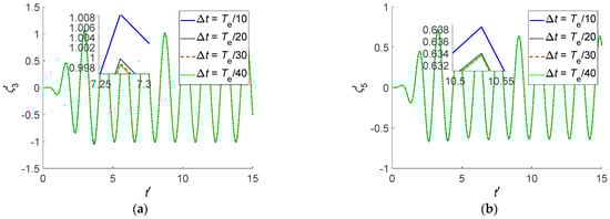 The constant coefficient matrix can be obtained by using the unit linear time-varying coefficient matrix []. The elements of on the principal diagonal are 1, and nonzero elements of the principal diagonal of are high power exponent of . As m increases, the power exponent of can be high enough, and the coefficient matrix tends to be the unit constant coefficient matrix. The specific values of ‘m’ can be selected based on convergence analysis for TFSGF evaluation, it’s fairly long, and it can refer to the paper by Li []. Thus, it can be obtained from Equation (38) as follows