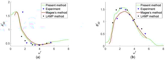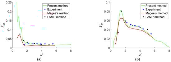 For the Wigley I hull at Fn = 0.2, Figure 12 presents the comparisons of the non-dimensional heave-heave added masses and damping coefficients, and Figure 13 presents the comparisons of the non-dimensional pitch-pitch added masses and damping coefficients. In the legend of Figure 12 and Figure 13, “present method” denotes numerical results obtained by the TFSGF method without waterline terms in Equation (5). “experiment” denotes previous literature experimental data [] obtained by Journée, and the experiments were carried out in the Shiphydromechanics Laboratory of the Delft University of Technology. The experimental data on hydrodynamic coefficients, wave loads, and added resistance for heave and pitch motions in head waves of Wigley I hull are sufficient. “Magee’s method” denotes numerical results obtained by the TFSGF method [] in which the waterline integral terms of boundary integral equations are included. “LAMP method” denotes numerical results obtained by LAMP software [], in which the body nonlinear method was adopted where the perturbation potential was computed on the instantaneous wetted hull under the mean free surface.
