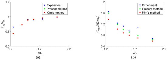 Figure 16 shows heave response amplitude operators (Raos) and pitch response amplitude operators for ship motions in head regular waves at Fn = 0.2. The response amplitude of heave motion can be defined as , and is the amplitude of ship heave motions. The response amplitude of pitch motion can be defined as , and is the amplitude of ship pitch motions. In Figure 16, “Kim’s method” denotes the numerical results obtained by a three-dimensional Rankine panel method in the linear time domain [].