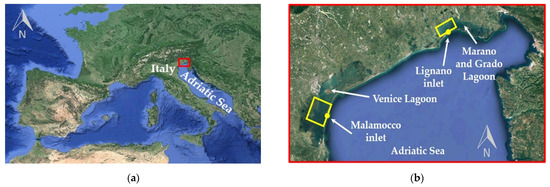 Coastal lagoons are highly dynamic and complex transitional environments that form after a sheltered basin is flooded by the sea and one or more openings (i.e., tidal inlets) allow a continuous water exchange with the sea during each tidal cycle [1]. Flood and ebb currents alternately originate from the gradient of the surface elevation between the sea and the inner lagoon, thereby governing all the hydrodynamic behavior. Furthermore, tidal inlets are fundamental in the morphodynamic processes of the nearby coast and of the lagoon itself. In fact, they act as both sources and sinks of the sediments which are suspended from the bottom by the wave motion, which is locally generated inside the basin or outside in the open sea [2,3,4,5,6,7,8,9,10]. Sediments are then transported by currents that transfer the material into the network of tidal channels or along the shore in the surf zone. The competing effects of waves and tides that attempt to close and widen the inlet, respectively [11,12], shape the morphology of the channel entering the lagoon. In this sense, the net exchange of sediments between the tidal basin and the sea largely affects the cross-sectional form of the tidal inlet, which adapts to dominant hydrodynamic and sediment transport conditions in the medium–long term (i.e., on the timescale of years or decades) [13].