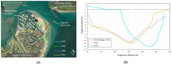 Historical reconstruction of the narrowing tendency of the cross-section of the Lignano inlet (a) from 1961 to 2020, and (b) the comparison between the profiles available in 1961 from Dorigo [52] (yellow continuous line), the one in the 1980s after the construction of the pier (purple dashed line) and that in the current configuration (light blue continuous line).