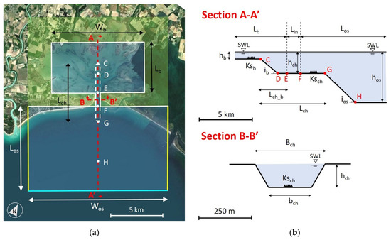 Idealized model of (a) the sea–channel–lagoon system and (b) the longitudinal and cross-sections of the entire domain (A-A’) and of the channel (B-B’), in which the main geometric features are reported.