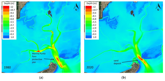 Details of the computational domains near the Lignano inlet showing the depth in (a) the condition immediately after the construction of the pier and (b) in the current state, in which the sand deposit that has formed over the years is also indicated.