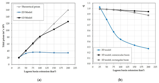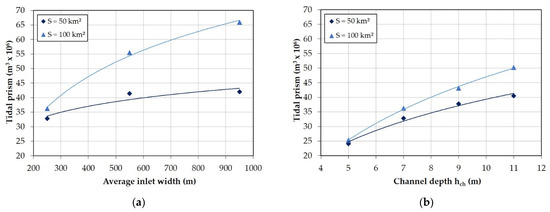 The set of simulations defined in Table 2 has been carried out by means of the 2D model applied to the basic configuration 0, with the purpose of analyzing the change of the tidal prism while keeping the inlet’s cross-section size fixed and only varying the transversal length of the lagoon basin. The results are depicted in Figure 5a, where the tidal prism values are plotted as a function of the lagoon basin extension.