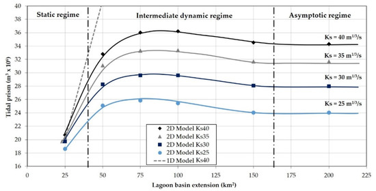 The curves show the trend of the tidal prism from the 2D model with variations in the extent of the lagoon basin and for different values of the Gauckler–Strickler coefficient of the entire domain. The three different regimes are also highlighted, showing the different behaviors of the relationship between prism and basin extension.