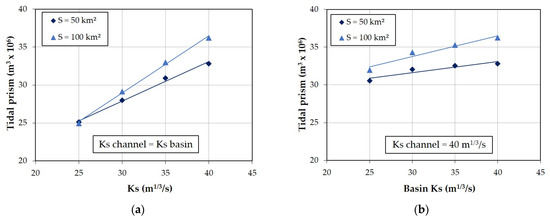 2D tidal prism for lagoon basins equal to 50 km2 (dark blue) and 100 km2 (light blue) with (a) a uniform value of the Gauckler–Strickler coefficient in the entire domain, or (b) with different coefficients for the channel and the basin.