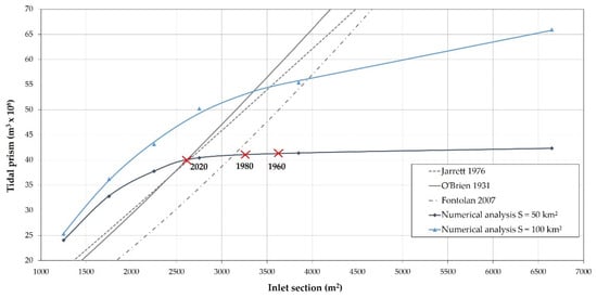 The determined curves, dark blue for the Sb50 and light blue for the Sb100 respectively, are characterized by an initial linear trend and then they tend to an asymptotic value, more evident for the Sb50 case, probably close to the value provided by the 1D model, as discussed above. The three red crosses, taken on the dark blue curve, correspond to the prism values that would occur for three cross-sectional areas of the Lignano inlet, as happened in three different years: in 1960, with the natural configuration before the port was built; in 1980 immediately after its construction and finally in 2020 with the sand deposit behind the pier and the current narrowing of the inlet. Both the 1960 and 2020 configurations can be considered close to an equilibrium condition, as suggested by Petti et al. [16]. In particular, the position of the three red crosses on the curve actually indicates that the prism differs slightly between the relative configurations, this part of the curve being almost horizontal. The current condition, seems to be a limit value, such that a further narrowing would lead to a more important reduction of the prism.