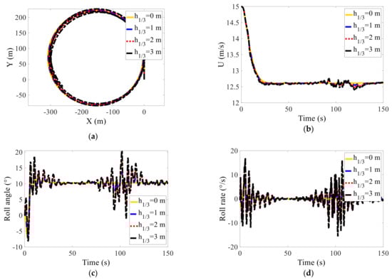 The correctness and applicability of the established model have been verified in our previous work []. Figure 2 shows the simulation results of ship turning motion under different sea states. The simulation parameters are as follows: the initial ship speed is 15 m/s, the fin angle is 0°, the rudder angle is 30°, the rudder rate is 10°/s, the initial encounter angle is 90°.