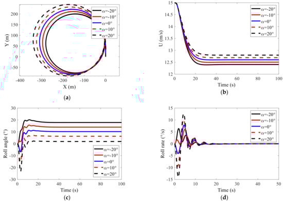 To investigate the effect of fin stabilizer on ship turning motion, the simulation of the ship turning in calm water with different fin angles of attack is conducted. The initial ship speed is 15 m/s, the rudder angle of attack is 30° and the rudder turning rate is 10°/s. The simulation results with fin angle of −20°, −10°, 0°, 10°, and 20° are shown in Figure 3. The main results data are given in Table 4. It should be noted that the total simulation time is 100 s, and the simulation results of the first 50 s of the roll angular velocity are given to clearly show the changes in the transition process.